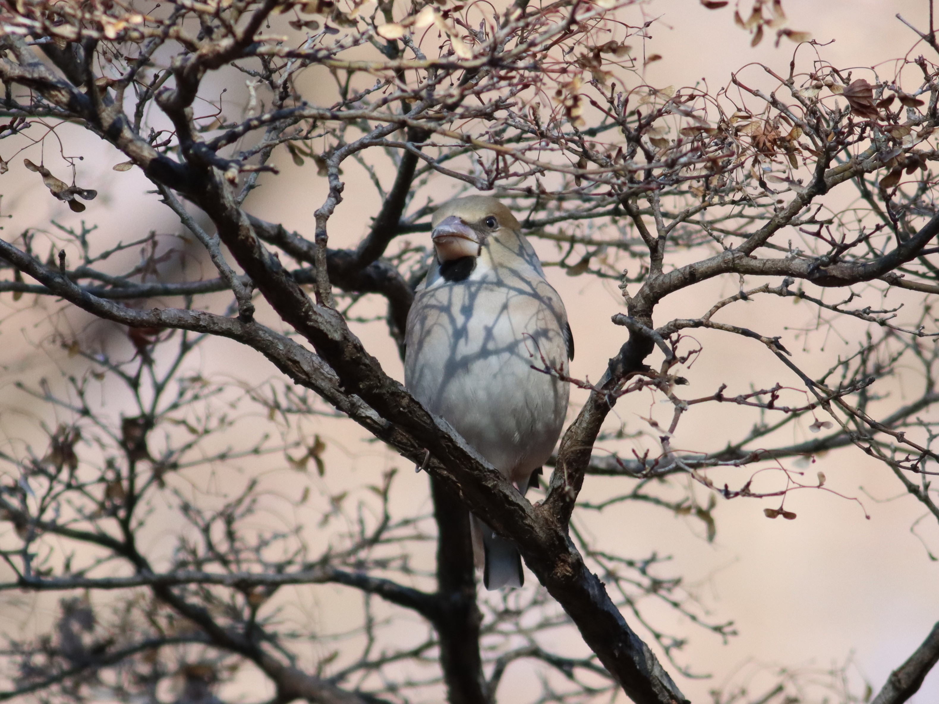 太いクチバシを持つアトリの仲間。顔は目から上が濃い茶色で下が灰茶色をしている。