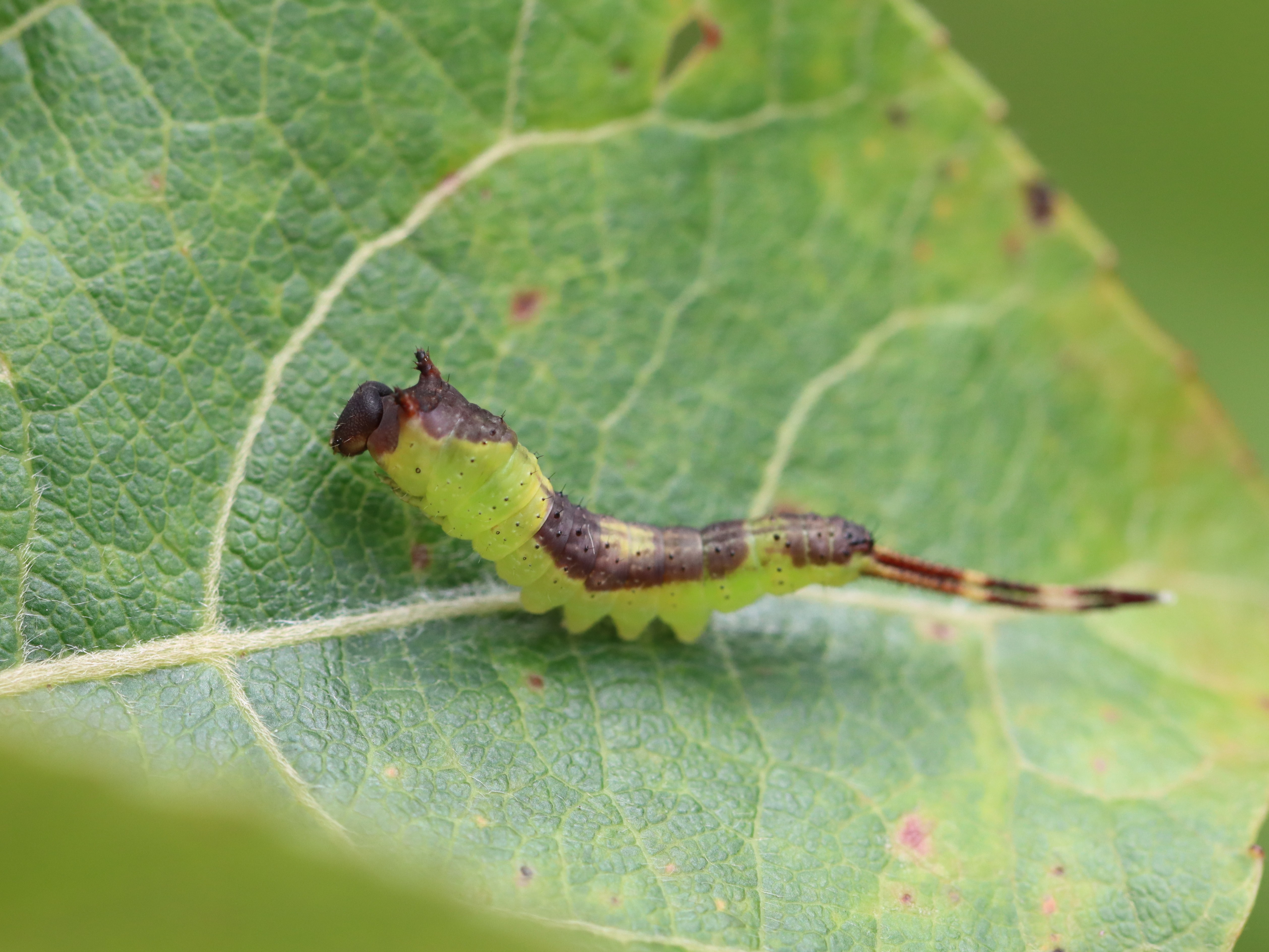 幼虫は日本の長い美脚が尾のように伸びている。