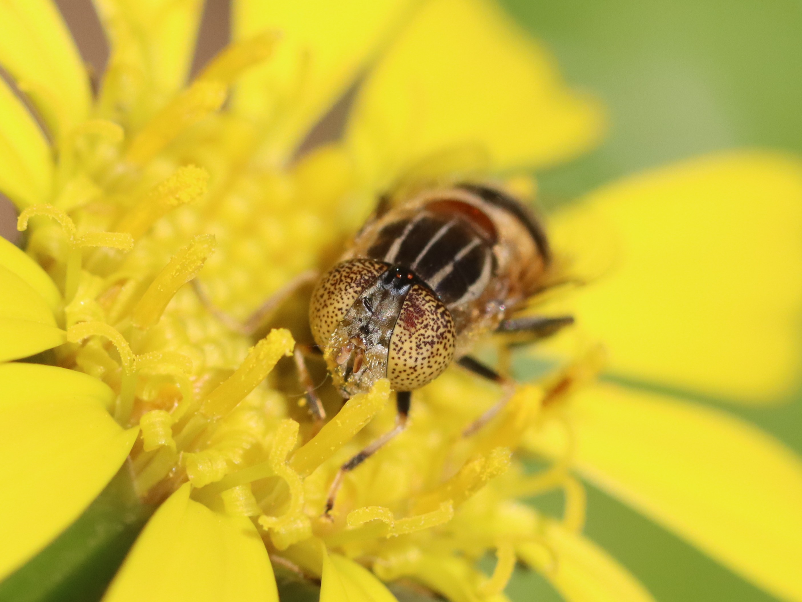 黄色い眼に褐色の班が分布する面白いハナアブ。 腹部の付け根が広く黄色くなるのでキゴシ(黄腰)という名前になったらしい。 眼の模様の方が気になると思うのだが、何故、腰に注目して名前をつけたのだろうか。
