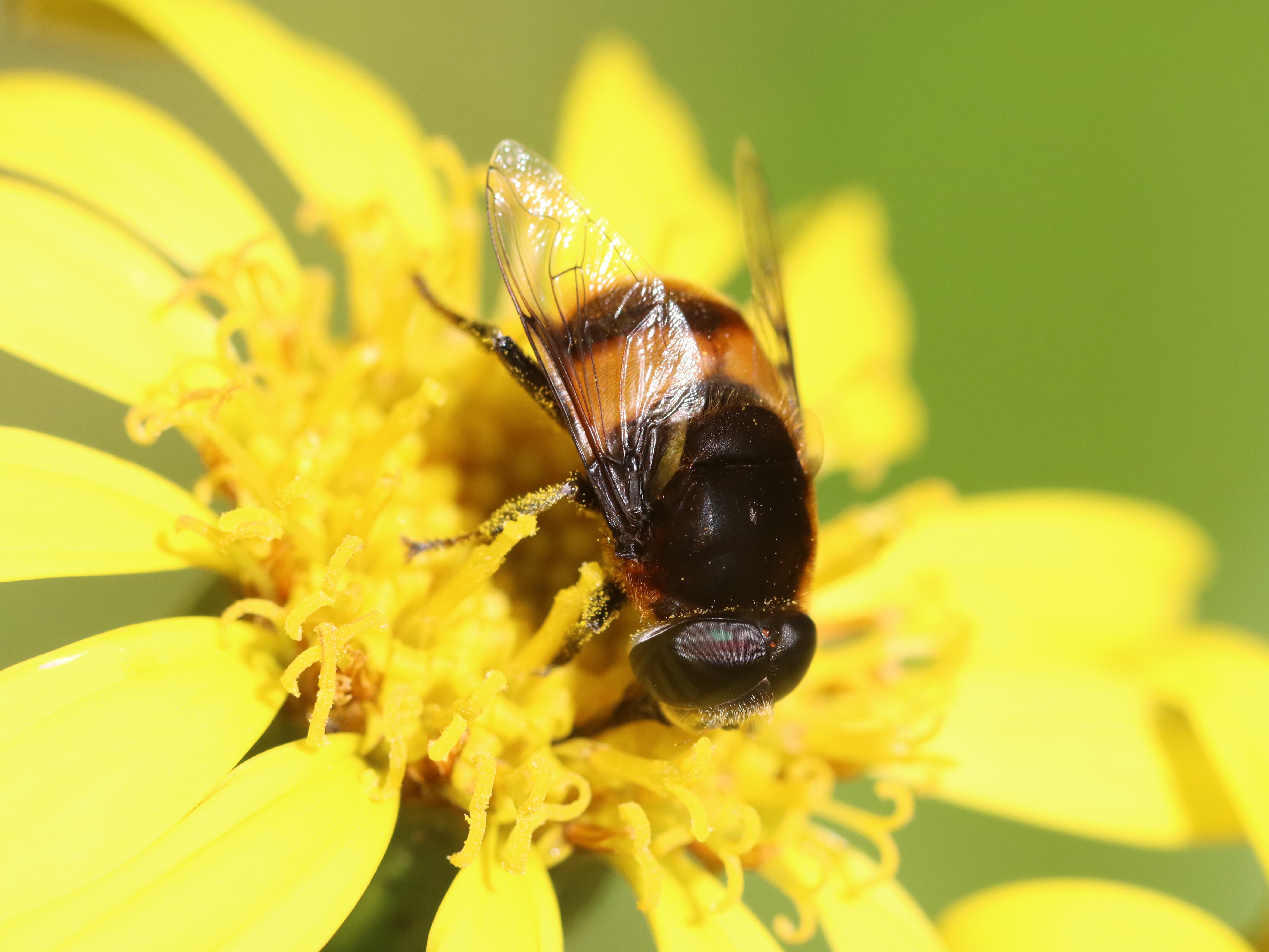 複眼に複雑な縞模様があるのが特徴。体型はコロコロしている。