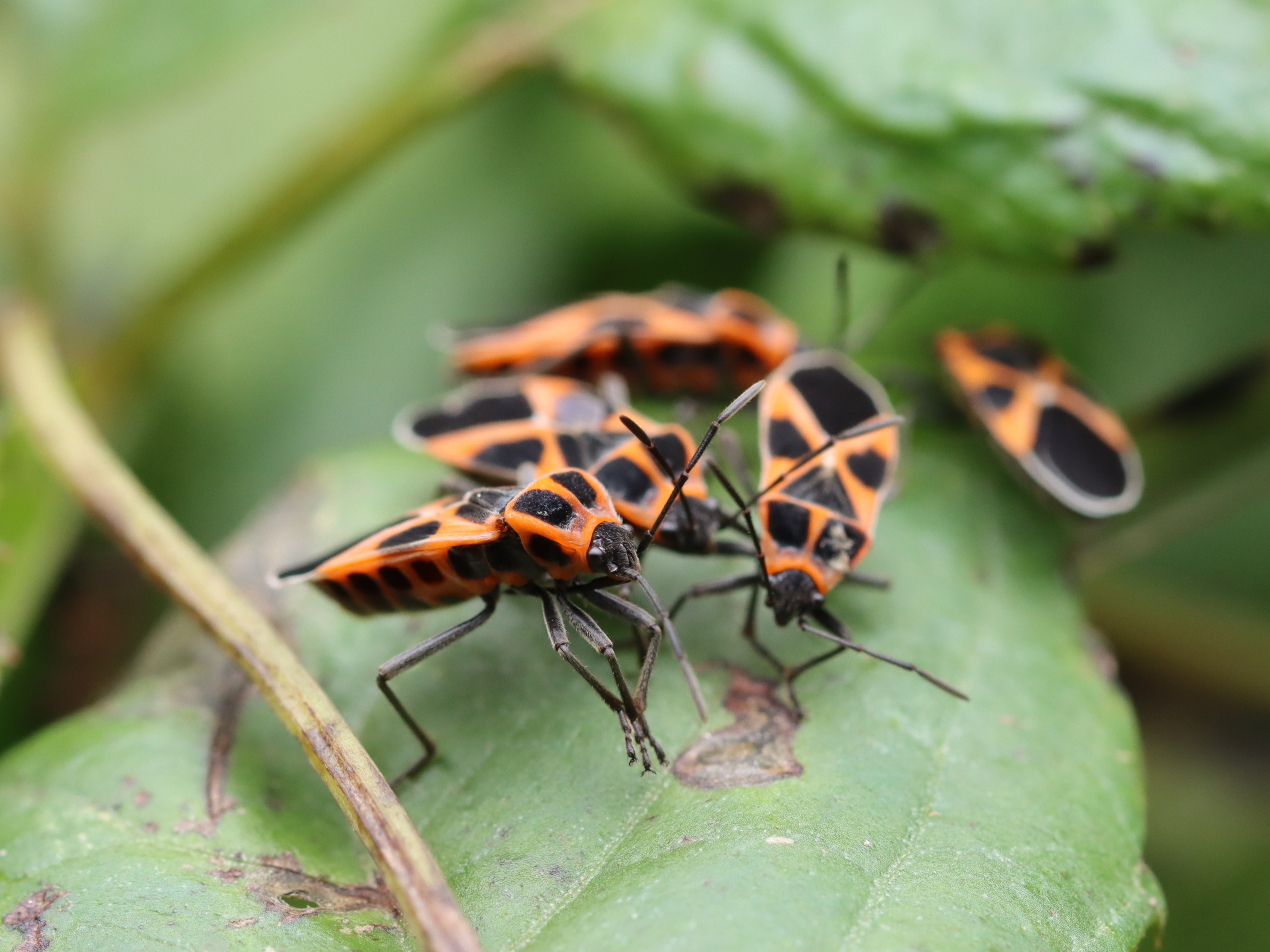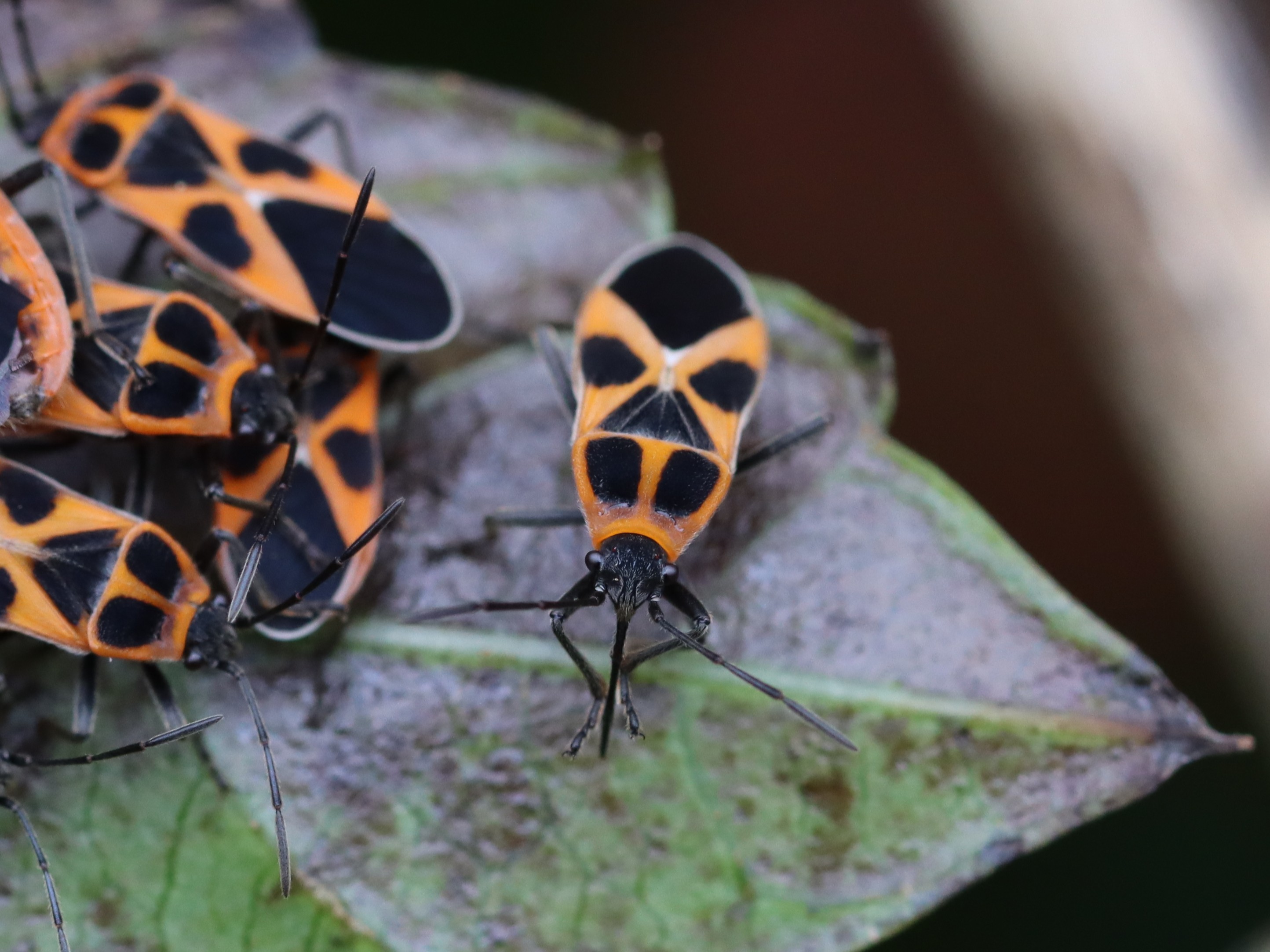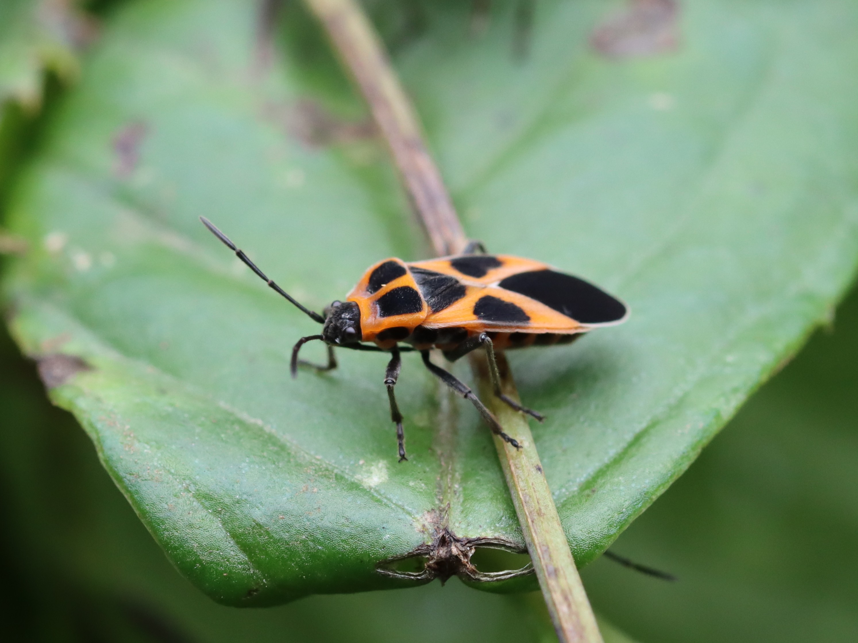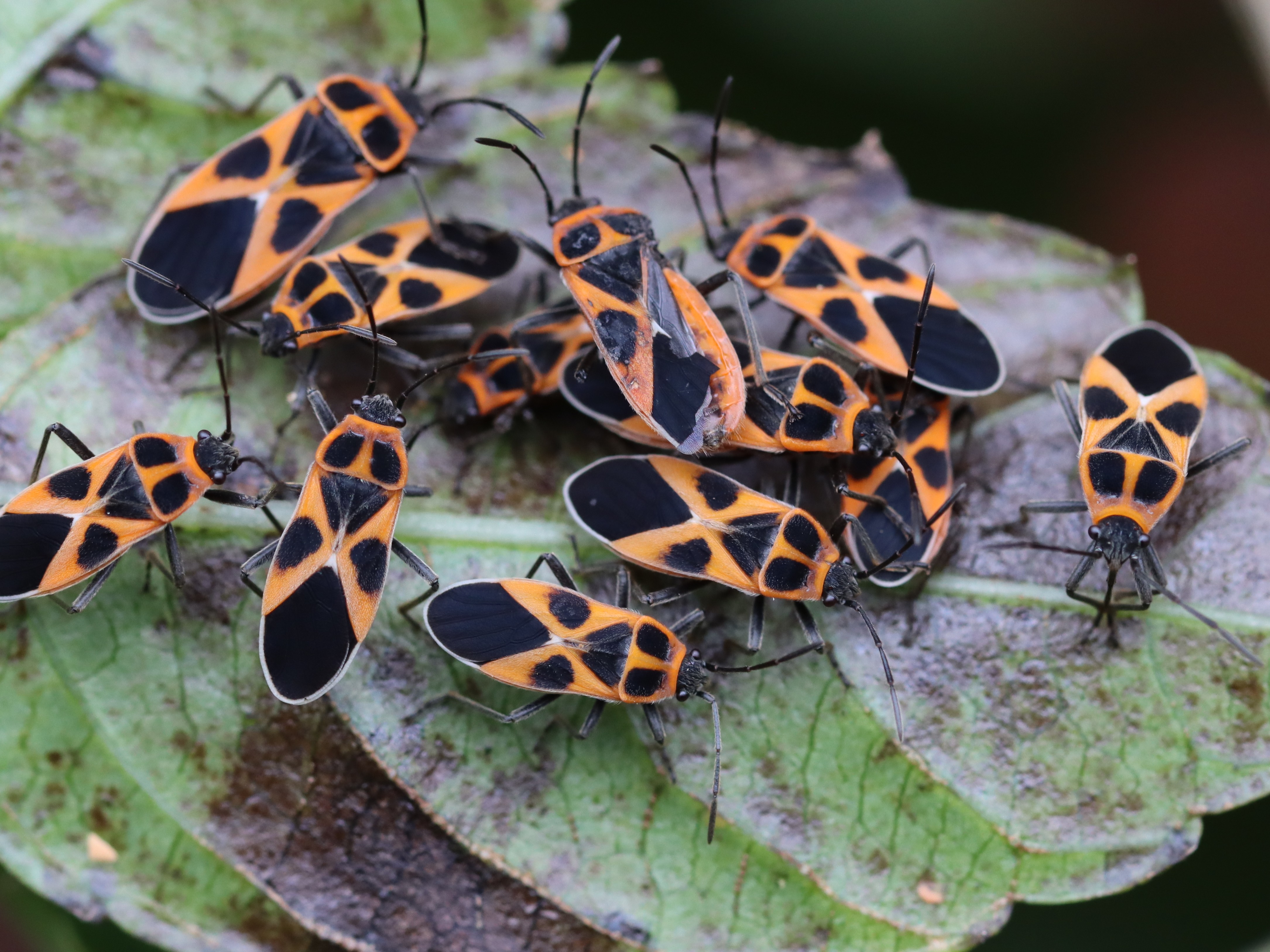 朱色と黒の特徴的な模様を持つカメムシ。